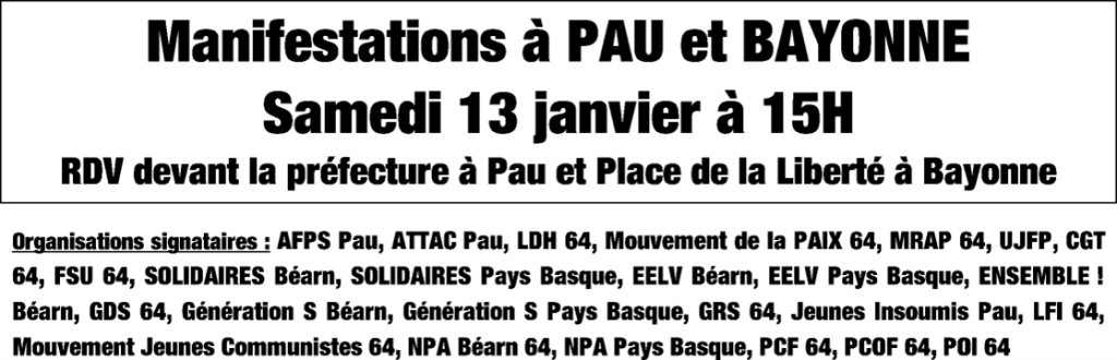 Manifestations 9 janvier à 18H30 RDV devant la préfecture à Pau et Place de la Liberté à Bayonne Depuis 3 mois, l’Etat d’Israël conduit une guerre sans pitié contre la […]