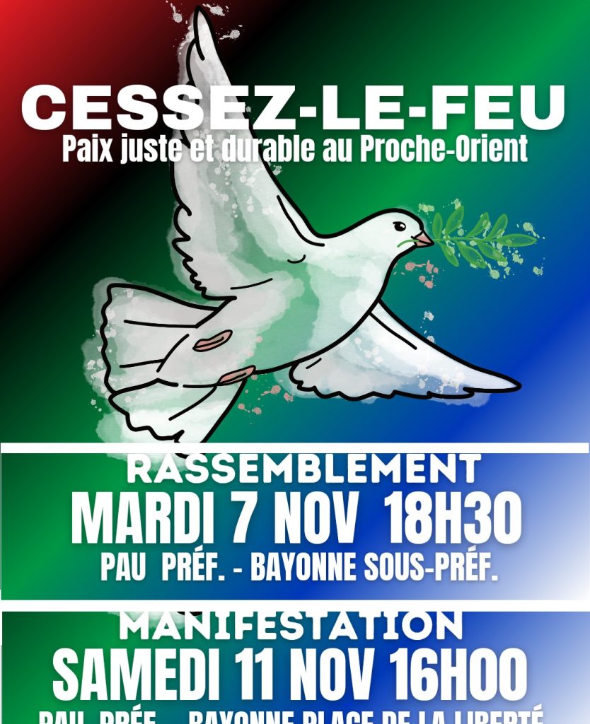 Rassemblement pacifique et citoyen-Pour un cessez le feu immédiat-Pour une solution négociée sur la base des résolutions de l’ONU -Pour une Paix juste et durable au Proche-Orient