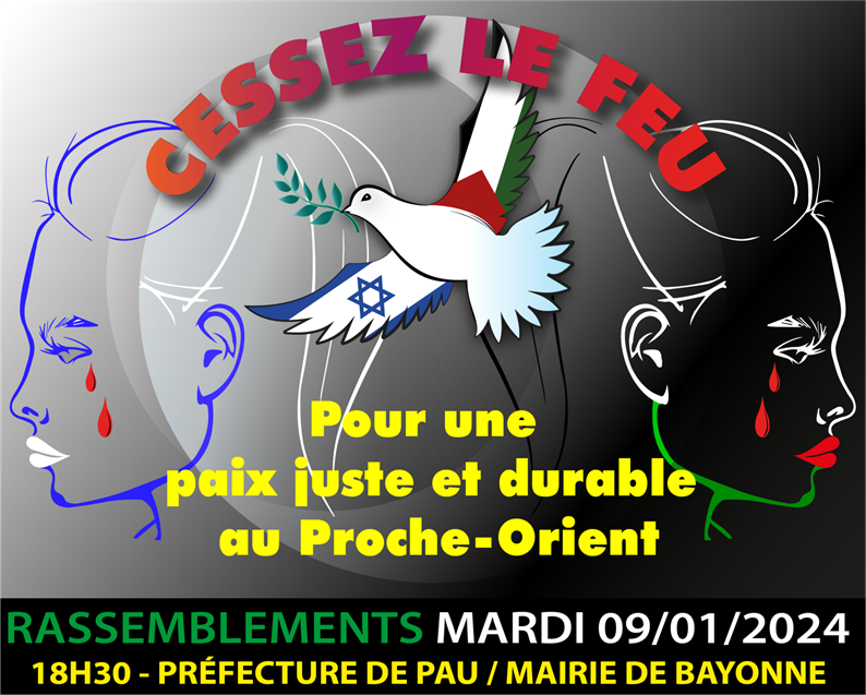 Comme dans de nombreuses villes à travers le monde entier, nous serons rassemblé·es ce samedi 13 janvier à 15h pour réclamer : un cessez-le feu total, immédiat et permanent, l’arrêt définitif de la guerre contre le peuple palestinien et des déplacements forcés de la population, la levée immédiate, complète et durable du blocus de Gaza, la Protection du peuple palestinien à Gaza et en Cisjordanie, l’Arrêt immédiat de toute coopération militaire, et la prise de sanctions contre Israël !